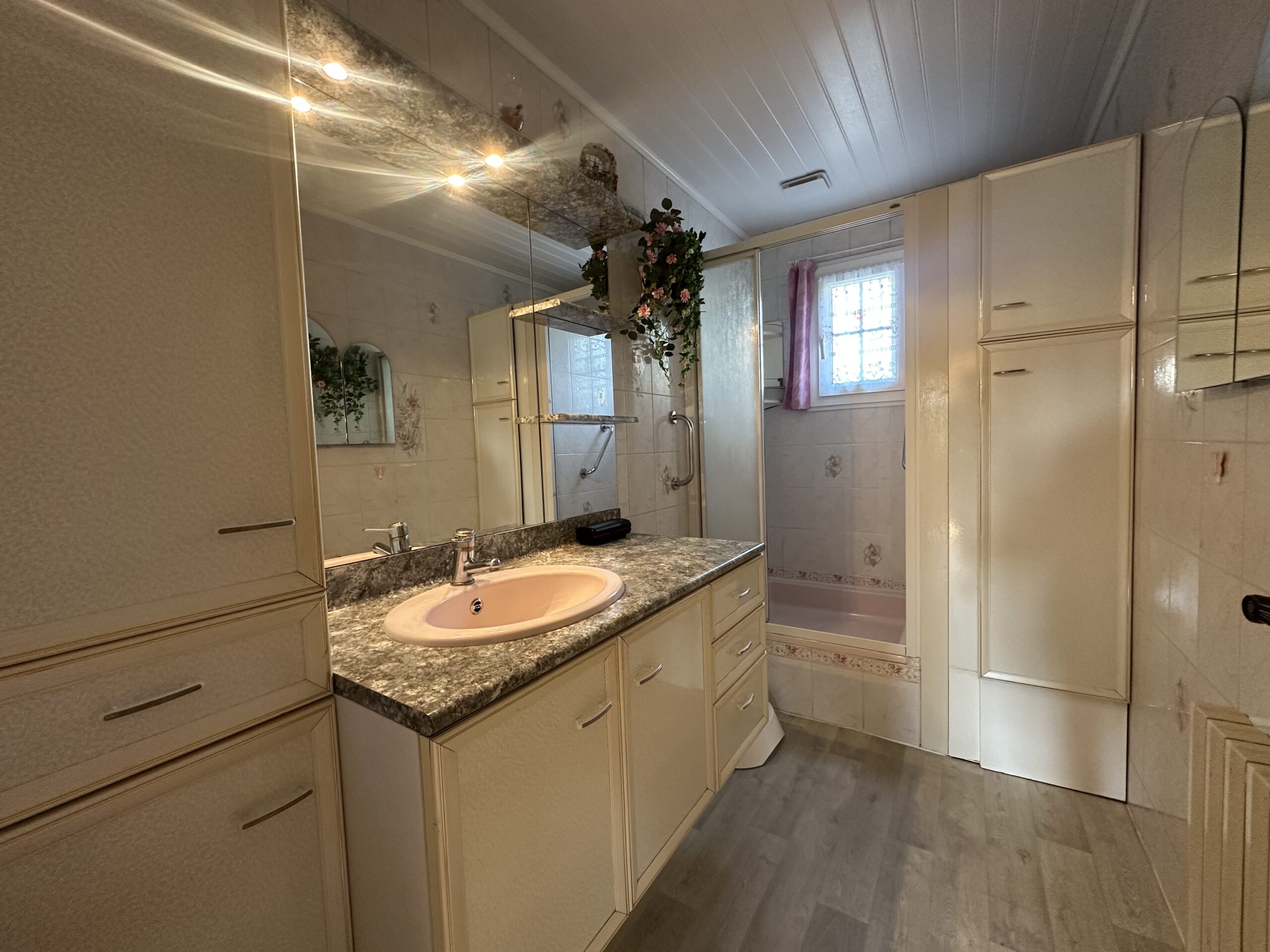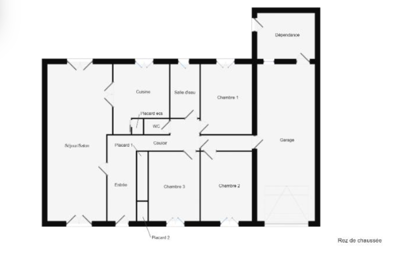 RDC : entrée, séjour/salon, cuisine aménagée, 2 chambres, bureau, salle de douches, wc,